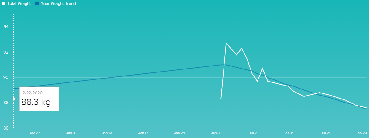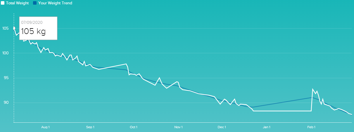 Ja, es gab einen Ausschlag Anfang diesen Jahres, aber mittlerweile stimmt die Richtung wieder und ich bin jetzt sogar schon unter dem Gewicht